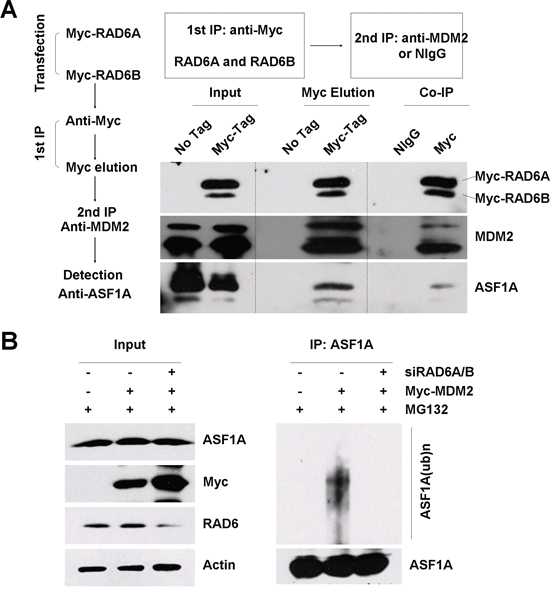 Figure 3: RAD6, MDM2 and ASF1A form a ternary complex. A. A two-step co-immunoprecipitation experiment was performed to test for ternary complex formation. HL-7702 cells were transfected with or without (no tag) Myc-RAD6 (RAD6A and RAD6B). The first immunoprecipitation was performed with an anti-Myc antibody. The complex was eluted using the Myc peptide. The second immunoprecipitation step used an anti-MDM2 antibody or the control mouse IgG (NIgG) to precipitate the complex. The protein samples from each step were then separately subjected to western blot analysis using anti-Myc, anti-MDM2, and anti-ASF1A antibodies. B. MDM2-induced ASF1A polyubiquitination is dependent on the presence of RAD6 in vivo. HL-7702 cells were transfected with (+) or without (–) Myc-MDM2 together with (+) or without (–) of RAD6 siRNAs for 48 h and incubated with 25 μM MG132 for another 10 h. Immunoprecipitation analysis was performed under denaturing conditions with an anti-ASF1A antibody. The anti-ASF1A antibody was also used to visualize the amounts of precipitated ASF1A and ubiquitinated ASF1A in the following western blot assay. The expression levels of ASF1A, Myc-MDM2 (Myc) and RAD6 are shown on the left.