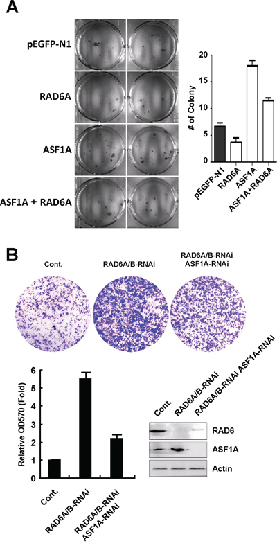 Figure 5: RAD6 and ASF1A negatively correlated in tumor cell proliferation and migration. A. Human lung cancer H1299 cells were transfected with an GFP empty vector, or a RAD6A-GFP, or a ASF1A-Red, or a combination of these two plasmids, and stable cell lines were generated. The cells were then used for a soft agar assay to determine the ability of cell proliferation. The quantification of the soft agar data are shown on the right. B. Knockdown of RAD6 expression promotes liver cell migration in an ASF1A-dependent manner. HL-7702 cells were transfected with or without RAD6A and RAD6B-specific siRNAs together with or without an ASF1A-specific siRNA as indicated for 48 h. The cells were then used for a Transwell assay to determine the cell migration ability. The quantification of the Transwell data and related RNAi efficiency are shown below.