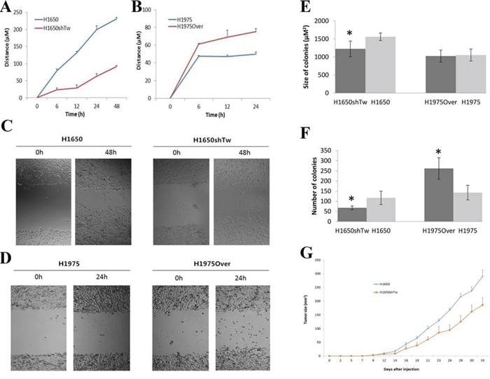 Figure 3: Effects of Twist1 on scratch and colony assays and in vivo xenograft tumor growth. Scratch assay in H1650 A. and H1975 B. after Twist1 modulation. Cells were allowed to migrate in control conditions or in the presence of Twist1 knockdown or overexpression. Images were obtained at 0 and 48 h in H1650 C. and at 0 and 24 h in H1975 D. after scratch formation. The effects of Twist1 on size E. and the number of colonies F. H1650shTw had a significantly smaller colony number and colony size compared to H1650 (P < 0.05), and H1975Over had an increased number of colonies (P < 0.05), but a similar size of colonies compared to H1975. In vivo xenograft tumor growth after implantation of H1650 and H1650shTw in nude mice G. Knockdown of Twist1 inhibits tumor growth (measured by tumor size) in mice implanted with H1650shTw compared to those with H1650.