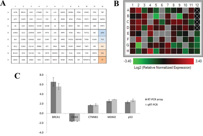 Figure 5: RT-PCR and qRT-PCR in H1650shTw and H1650 cells. A total of 88 genes of interest were compared between H1650shTw to H1650 using RT-PCR array A. The heat map showed fold changes of gene expression data in H1650shTw compared to H1650. Undetected genes are labeled with gray B. Gene expression data of BRCA1, CD44, CTNNB1, MDM2, and p53 from both RT-PCR array and qRT-PCR C.