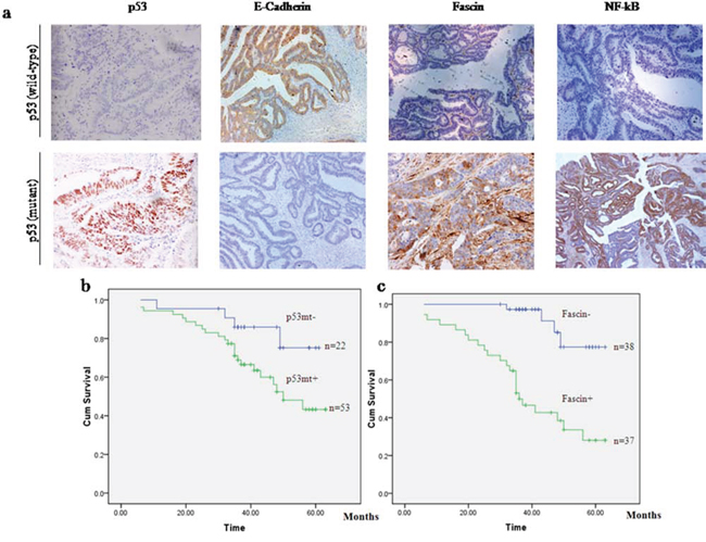 Figure 1: p53 mutation and Fascin expression are associated with poor clinical outcome in patients with colorectal adenocarcinomas. a. Immunohistochemistry of E-cadherin, Fascin and NF-κB in serial sections of colorectal adenocarcinoma specimens with wildtype or mutant p53. The original magnification: × 200. b. Kaplan–Meier plots of overall survival for patients with colorectal adenocarcinomas with (p53mt+) or without (p53mt−) p53 mutation. c. Kaplan–Meier plots of overall survival for patients with colorectal adenocarcinomas with (Fascin+) or without (Fascin−) Fascin expression.