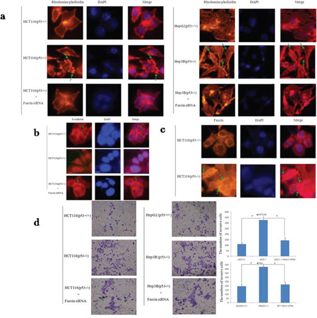 Figure 2: p53 and Fascin correlate with colorectal cancer cell migration in vitro. a. Cell morphology and cytoskeleton analysis by immunofluorescence microscopy. Green stars indicate filopodia. The experiments were performed in triplicate. b. Representative images of E-cadherin expression in HCT116 cells. Photos were taken under × 400 magnification. Green stars indicate Fascin wxpression. The experiments were performed in triplicate. c. Representative images of Fascin expression in HCT116 cells. Photos were taken under × 400 magnification. Green stars indicate Fascin wxpression. The experiments were performed in triplicate. d. Transwell invasion assay by the 24-transwell system and quantitative analysis. The pictures were taken 24 h after seeding (original magnification: × 100). The numbers of invasive cells were counted in five representative high power fields per transwell. Three independent experiments were carried out in triplicate.