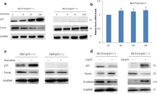 Thus far, little is known about transcriptional regulation of Fascin. To examine whether Fascin expression is suppressed by p53 in response to stimuli, we subjected HCT116 p53+/+ to treatment with glucose deprivation. At 12 h after the deprivation of glucose, Fascin protein levels were significantly downregulated in parallel with upregulated wtp53 accumulation (Fig. 3a), but Fascin mRNA levels did not change (Fig. 3b), suggesting that Fascin is not transcriptionally regulated by wtp53. By contrast, the effects of glucose deprivation on Fascin levels were abolished in p53−/− mouse embryo fibroblasts (MEFs) (Fig. 3c), indicating that Fascin downregulation is through wtp53. For further confirmation, we used short interfering RNA (RNAi) to knock down p53 expression in HCT116 p53+/+ cells and transfected HCT116 p53−/− cells by p53 adenovirus plasmid. As shown in Fig. 3d, Knockdown of wtp53 increased Fascin expression, conversely, restoration of wtp53 caused a decrease in Fascin protein levels. These data suggest that wtp53 suppressed Fascin protein expression.