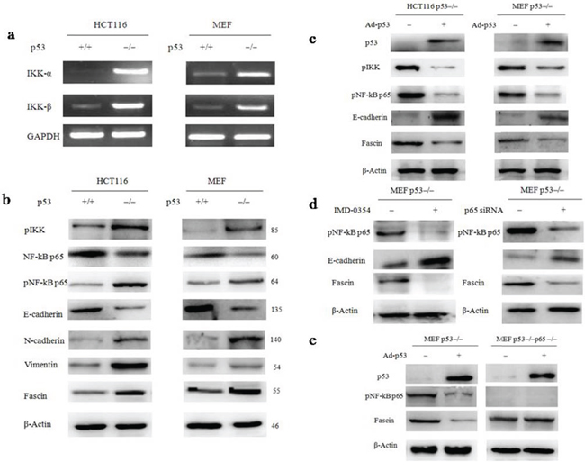 Figure 4: NF-κB is a key determinant for p53 deletion-mediated the up-regulation of Fascin. a. The expression of IKKα and IKKβ, typical NF-κB target genes, in wild-type and p53−/− HCT116s and MEFs was examined by RT-PCR. b. The expression of several key NF-κB signals regulators, E-Cadherin, N-Cadherin, Vimentin and Fascin were examined by western blotting (the blots were cropped, and the full-length blots are included in the supplementary information). c. The expression of pIKK, pNF-κB p65, E-Cadherin and Fascin in p53−/− cells after the cells were transfected with p53 adenovirus plasmid. d. The expression of pNF-κB p65 and Fascin in p53−/− MEFs after the cells were treated with the compound IMD-0354 or p65 siRNA. e. p53 deletion-induced Fascin activation is NF-κB-dependent. p53−/− and p53−/−p65−/− MEFs were infected with a p53 adenovirus plasmid for 48 h, and cell lysates were analysed by western blotting with the indicated antibodies (the blots were cropped, and the full-length blots are included in the supplementary information).