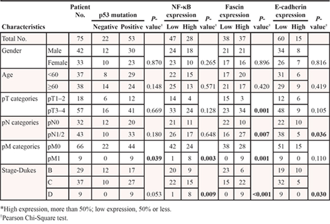 Table 1: Correlation between clinicopathological background and p53 mutation status as well as NF-κB, Fascin, and E-cadherin expression in tumor specimens from 75 colorectal adenocarcinoma patients