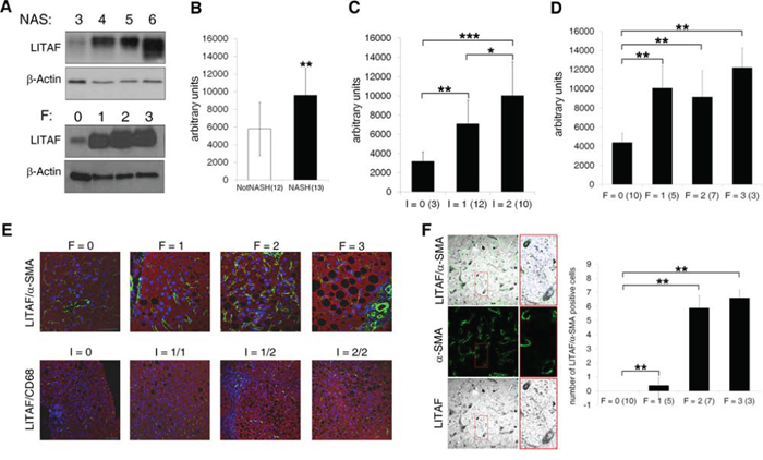 Figure 1: Hepatic LITAF expression increases in NAFLD children correlating with histological traits of hepatic inflammation and fibrosis. A. Immunoblot analysis of total LITAF protein expression in liver from NAFLD children according to NAS and fibrosis (n = 25). The immunoblot is representative of 3 different Western Blottings. Lanes were run on the same gel but were non-contiguous. B–D. Quantitative densitometric analysis of LITAF protein expression in patients (B) with NASH vs. NotNASH, (C) with I = 0 vs. I = 1 vs. I = 2 and (D) F = 0 vs. F = 1, vs. F = 2 vs. F = 3. Histogram represents the mean values ± standard deviation (SD). E. Representative confocal imaging of α-SMA/LITAF (green/red) and CD68/LITAF (green/red) respect to fibrosis (0–3) and inflammation (0–2) grading in liver tissues from NAFLD children (n = 25). The nuclei are in blue (scale bar: 50 μm for fibrosis; scale bar: 100 μm for inflammation). F. Representative confocal laser microscopy of LITAF (grey) and α-SMA (green) in liver tissues from NAFLD children. The two labels are merged with nuclei. Nuclei were counterstained with DAPI (blue) (scale bar: 50 μm). The histogram represents the mean ± SD of LITAF/α-SMA positive HSCs in samples with F = 0 vs. F = 1 vs. F = 2 vs. F = 3 (n = 25). Differences across groups were analysed by Student's two-tailed or ANOVA as appropriate. *p < 0.05, **p < 0.01, ***p < 0.001.