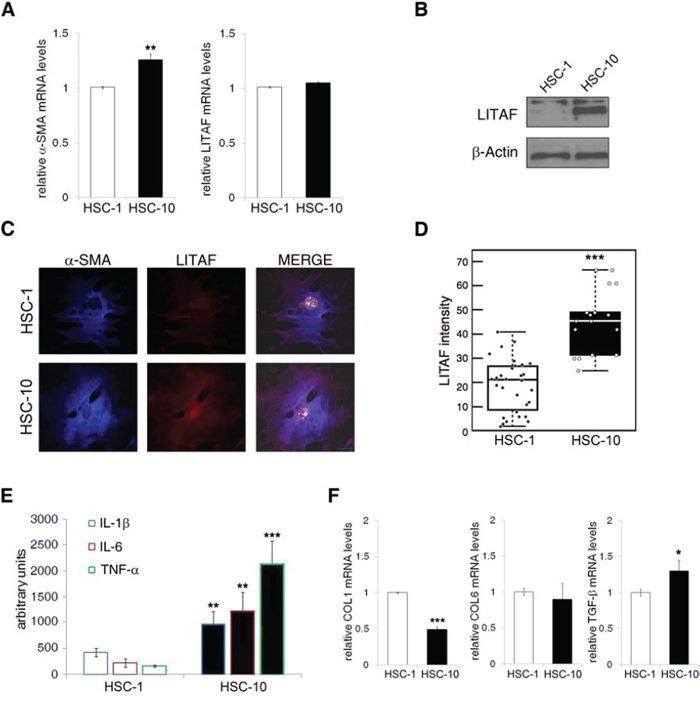 Figure 2: LITAF expression/activity and inflammatory response is upsized by serum in activated primary mouse HSCs. A–F. Primary mouse activated HSCs were serum starved for 24 h and then treated with either 1% (HSC-1) or 10% FBS (HSC-10) at different timepoints. A: QRT-PCR analyses of α-SMA and LITAF mRNA expression at 2 h (n = 3). B: Immunoblot analysis of total LITAF at 3 h (data presented is representative of three independent experiments). C: Representative confocal imaging of α-SMA (blue), LITAF (red) and nuclei (stained with DRAQ5, white) at 2 h (scale bar: 20 μm). D: Quantitative imaging analysis of LITAF nuclear translocation (n cells > 50). Mann-Whitney U test. E: Semi-quantitative protein expressions of IL-1β, IL-6 and TNF-α in total cell lysate of HSC-1 and HSC-10 by using a Cytokine Antibody Array (n = 2 in duplicate) at 3 h. F: QRT-PCR analyses of COL1, COL6 and TGF-β at 2 h (n = 3). Histograms represent the mean ± SD. *p < 0.05; **p < 0.01; ***p < 0.001 vs. HSC-1, Student's t test.