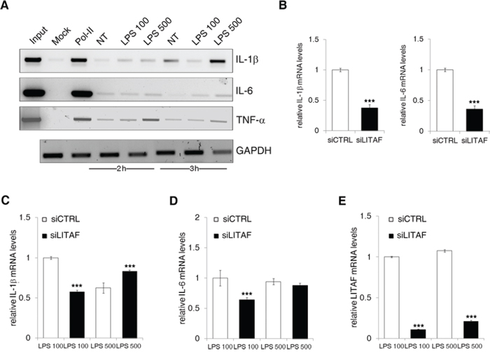 Figure 5: LITAF binds and regulates IL-1β and IL-6 promoters. A. LX-2 cells were exposed for 2 and 3 h to 100 ng/ml and 500 ng/ml LPS. Input, mock and mouse anti-RNA Pol II antibody were used as ChIP control. LITAF immunoprecipitated was used for the amplification by qPCR of IL-1β, IL-6 and TNF-α promoters. Input DNA was used to assess GAPDH transcript for normalization (data presented are representative of three independent experiments). B. QRT-PCR analysis of IL-1β and IL-6 in control (siCTRL) and LITAF-silenced (siLITAF) LX-2 cells. C–E. siCTRL and siLITAF LX-2 cells treated with 100 ng/ml and 500 ng/ml LPS. QRT-PCR of IL-1β (C), IL-6 (D) and LITAF (E) mRNA in the presence of LPS at 3 h (n = 3). Histograms represent the mean ± SD. ***p < 0.001 for comparison between siCTRL and siLITAF cells, Student's t test.