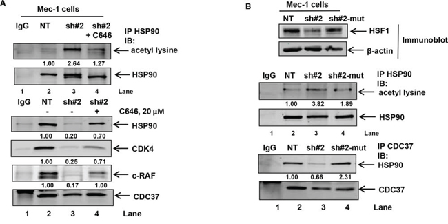 Figure 6: Treatment with the p300 inhibitor C646 or expression of shRNA insensitive HSF1 construct decreases HSF1-knockdown induced HSP90 acetylation and binding of HSP90 to CDC37. A. Immunoprecipitation of HSP90 from NT, shHSF1 or shHSF1 Mec-1 cells treated with 20 μM, C646 for 24 hours followed by immunoblotting for acetyl lysine and HSP90 (top panel). Immunoprecipitation of CDC37 followed by immunoblot analysis of HSP90 and the indicated HSP90 client kinases (bottom panel). B. Expression of shHSF1-insensitive HSF1 plasmid in shHSF1-transduced Mec1 cells followed by immunoprecipitation of HSP90 and CDC37 to assess HSP90 acetylation (top panel) as well as binding of CDC37 to HSP90 (bottom panel), respectively.