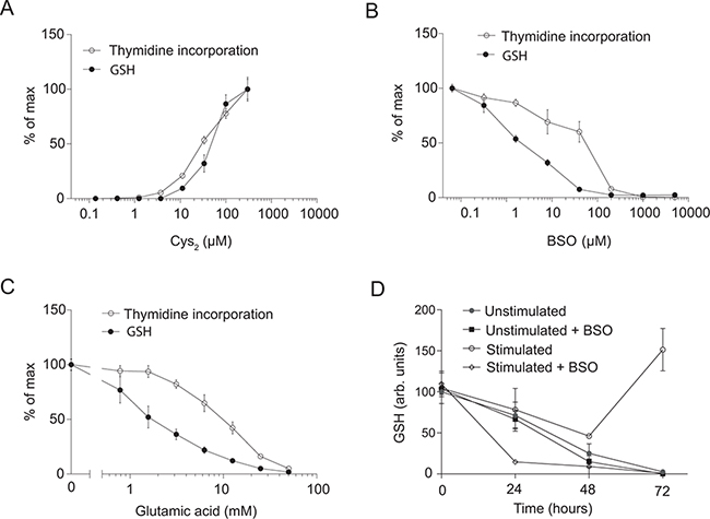 Figure 1: Exogenous cystine is required for GSH and DNA synthesis. A. Thymidine incorporation and GSH levels of CD4+ T cells activated for 3 days in Cys2-free DMEM medium supplemented with increasing amounts of Cys2. B. Thymidine incorporation and GSH levels of CD4+ T cells activated for 3 days in X-VIVO 15 medium supplemented with increasing levels of BSO. C. Thymidine incorporation and GSH levels of CD4+ T cells activated for 3 days in DMEM medium supplemented with the indicated concentrations of glutamic acid. (A–C) Data are shown as percentage of maximum 3H-thymidine incorporation and GSH levels, respectively. D. GSH levels of CD4+ T cells either left unstimulated or activated for 0–72 hours in the presence or absence of 100 μM BSO. (A–D) Data are given as mean ± SEM from at least two experiments, each carried out in triplicates.
