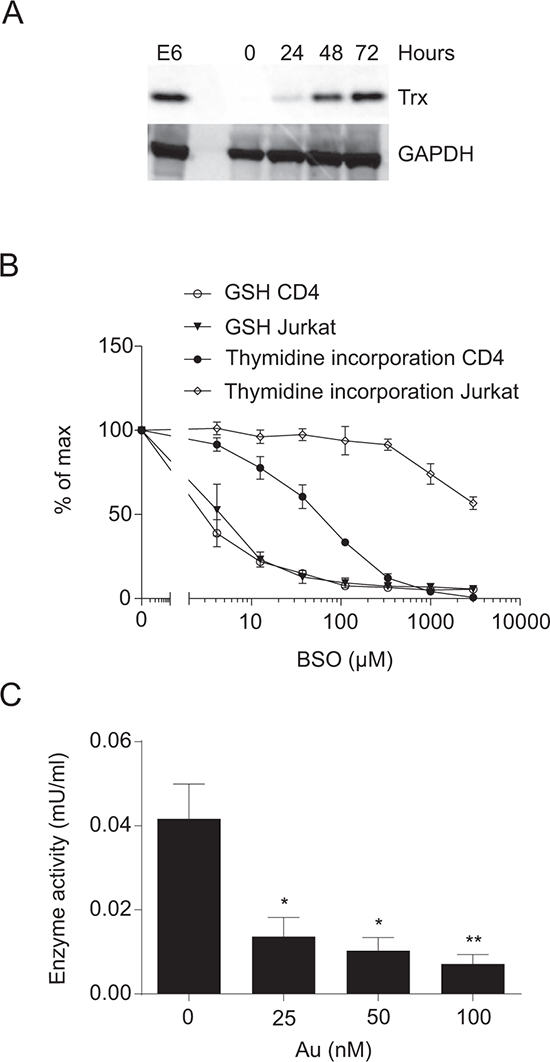 Figure 2: Thioredoxin in primary CD4+ T cells and Jurkat cells. A. Representative Western blot of Trx and GAPDH (loading control) in Jurkat cells (E6) and CD4+ T cells activated for 0–72 hours in X-VIVO 15 medium. B. Thymidine incorporation and GSH levels of CD4+ T cells activated in X-VIVO 15 medium and Jurkat cells cultured in RPMI-1640 medium for 48 hours in the presence of the indicated concentrations of BSO. Data show mean ± SEM of two experiments carried out in duplicates. C. Thioredoxin reductase activity of CD4+ T cells activated for 3 days in X-VIVO 15 medium with the indicated concentrations of Au. Data show mean ± SEM of four experiments.