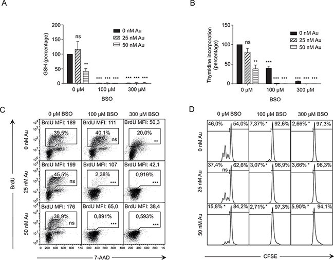 Figure 3: Thioredoxin and GSH can partly substitute for each other in DNA synthesis. A. GSH levels and B. thymidine incorporation of CD4+ T cells activated for 3 days in X-VIVO 15 medium in the presence of the indicated concentrations of BSO and Au. Data show mean ± SEM of three experiments carried out in duplicates. C. DNA synthesis as measured by BrdU incorporation and 7-AAD staining and D. cell division as measured by CFSE dilution of CD4+ T cells activated for 3 days in X-VIVO 15 medium in the presence of the indicated concentrations of BSO and Au. Data show representative results from two experiments carried out in duplicates.