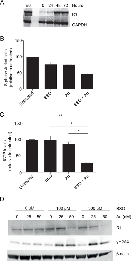 Figure 4: Inhibition of GSH and Trx impairs dNTP production and induces γH2AX. A. Representative Western blot of R1 and GAPDH (loading control) in Jurkat cells and CD4+ T cells activated for 0–72 hours. The same gel as shown in Figure 2A was stripped and reblotted with antibodies against R1. B. The fraction of Jurkat cells in S phase relative to untreated cells 16 hours after release from serum starvation. The cells were either left untreated, treated with 300 μM BSO, 200 nM Au or a combination of both. C. dCTP levels in cell cycle-synchronized Jurkat cells treated as in (B) dCTP measurements are shown as mean ± SEM of two experiments carried out in triplicates. D. Representative Western blot of R1, γH2AX and β-actin (loading control) in CD4+ T cells activated for 3 days in the presence of the indicated concentrations of BSO and Au.