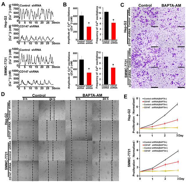 Figure 1: CD147 promotes HCC cells invasion, migration and proliferation by regulating [Ca2+]i oscillations. A. [Ca2+]i oscillations were tested by [Ca2+]i measurements in fluo-8-loaded control cells and CD147 knockdown cells after stimulation with EGF. B. Histograms of [Ca2+]i oscillations amplitudes and frequencies in control cells and CD147 knockdown cells after EGF stimulation are shown. C. Invasive potential D. migration ability and E. normalized proliferation in control cells and CD147 knockdown cells incubated with or without BAPTA-AM. Bars represent each sample performed in triplicate, and the error bars represent the standard deviations. *p < 0.05, by Student’s t-test.
