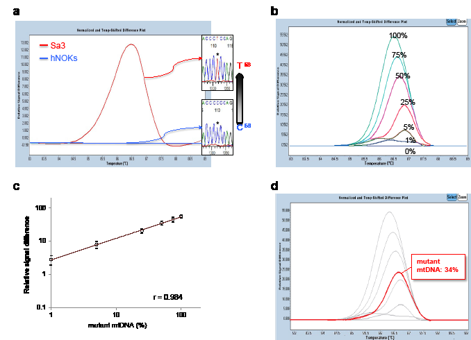 We optimized the conditions and examined the feasibility of using qPCR-HRMA for detecting three different mutations (D-loop-C68T, 12S-A1107G, and 16S-T3190C). The following PCR primers were designed and used for the analyses. The primer sequences were: D-loop region: Forward 5’-GCTCTCCATGCATTTGGT-3’ (38-55), Reverse, 5’-ACACTTTAGTAAGTATGTTCGCC-3’ (206-184); 12S-rRNA region: Forward, 5’-ATATCTGAACACACAATAGCTAAGAC-3’ (1039-1064), Reverse, 5’-TAGAGGGATATGAAGCACCG-3’ (1196-1177); and 16S-rRNA region: Forward, 5’-GTAATCCAGGTCGGTTTCTA-3’ (3082-3101), Reverse, 5’-ACCGGGCTCTGCCATCTTAA-3’ (3250-3231). Using these PCR primer sets, qPCR-HRMA was performed using a LightCycler 480 system (Roche Diagnostics GmbH, Mannheim, Germany) in a final volume of 20 µl of a reaction mixture comprised of 10 μl of LightCycler 480 High Resolution Melting Master mix (Roche), 3 mM of MgCl2, and 4 μM of the primers, according to the manufacturer’s instructions.