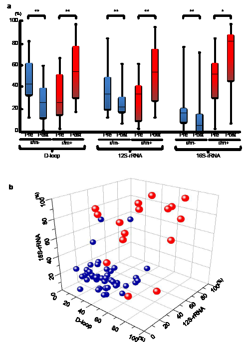Figure 3 (A) The status of mutant mtDNA levels in patients with OSCC with (red boxes) or without (blue boxes) r/m preoperatively or postoperatively. The r/m- groups have significantly decreased mutant mtDNAs postoperatively compared to preoperatively, whereas significantly increasing mutant mtDNA levels were detected at all regions in sera obtained postoperatively from r/m+ patients. The statistical significance of the data was determined using the Mann-Whitney U test. P<0.05 was considered significant. *P<0.05; **<0.01. The data are expressed as the mean ± standard error of the mean. The horizontal lines indicate the medians. All experiments were performed in triplicate. (B) To more clearly illustrate the specificity of the status of mutant mtDNA levels in the three different regions, we used Origin 8.6 software (OriginLab Co., Northampton, MA, USA) to create a three-dimensional scatterplot with an x-axis indicating the levels in the D-loop, a y-axis for the 12S-rRNA, and a z-axis for the 16S-rRNA, respectively. Data point sets from 61 patients with OSCC are plotted as circles. Most of the r/m- patients (blue) are very close (below 50%) on the X (D-loop)-Y (12S-rRNA)-Z (16S-rRNA) plane; the r/m+ group tends to indicate higher (>50%) amounts of mutant mtDNA.