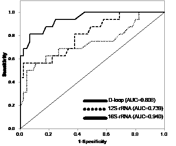 Figure 4: ROC curves and AUC for the D-loop, 12S-rRNA, and 16S-rRNA. To evaluate the diagnostic relevance for predicting the r/m of serum mutant mtDNAs, we used the ROC curve by plotting sensitivity versus specificity. The AUCs for mutant mtDNAs are 0.808 for the D-loop, 0.739 for the 12S-rRNA, and 0.940 for the 16S-rRNA, indicating that the diagnostic potential of the level of serum mutant mtDNA 4 weeks after surgery is confirmed as indicated by the AUC values for the different regions examined. The thinner solid line indicates the diagonal representing a hypothetical test with no diagnostic discrimination. The statistical significance of the study data was determined using the Mann-Whitney U test. P<0.05 was considered significant. Data are expressed as the mean ± standard error of the mean. Statistical analyses were performed using SPSS 17.0 software (SPSS Inc., Chicago, IL, USA).