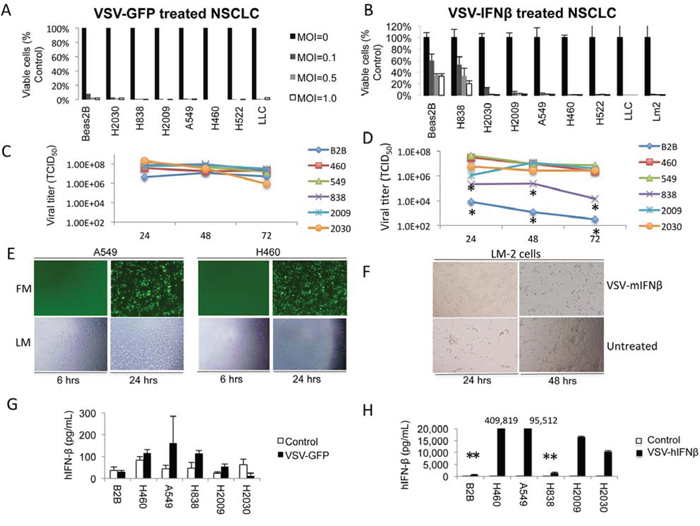 Figure 1: VSV-GFP and VSV-hIFNβ are cytotoxic to NSCLC cells. A. Human NSCLC cell lines and Beas2B cells (control) were infected with VSV-GFP at the indicated MOI. Cell viability was determined after 72 hours by trypan blue exclusion. B. Human and murine NSCLC cell lines and Beas2B cells were infected with VSV-hIFNβ and VSV-mIFNβ, respectively, at the indicated MOI. LLC and LM2 are murine NSCLC lines; all other lines are human NSCLC. Cell viability was determined after 72 hours by trypan blue exclusion. C and D. Viral titer was determined by collecting supernatant from NSCLC cell lines and Beas2B cells treated in vitro with an MOI of 0.1. Supernatant was collected daily after infection with either VSV-GFP (C) or VSV-hIFNβ (D) * indicates statistically significant result comparing Beas2B and H838 to the rest of the NSCLC cell lines. E. Representative fluorescence and light micrographs of NSCLC cells infected with VSV-GFP at 6 and 24 hours. F. Light micrographs showing cytopathic effect of VSV-mIFNβ against murine LM2 cells after infection. G and H. Production of human IFNβ was determined by collecting supernatant from NSCLC cell lines and Beas2B cells treated in vitro with an MOI of 0.1. Supernatant was collected at 48 hours after infection with either VSV-GFP (G) or VSV-hIFNβ (H) and tested for the presence of hIFNβ by ELISA, and ** signifies p < 0.0001 comparing Beas2B and H838 to the other NSCLC cell lines. Numbers above the bar graphs indicate the hIFNβ level in the supernatant (in pg/mL). Error bars indicate standard deviation.