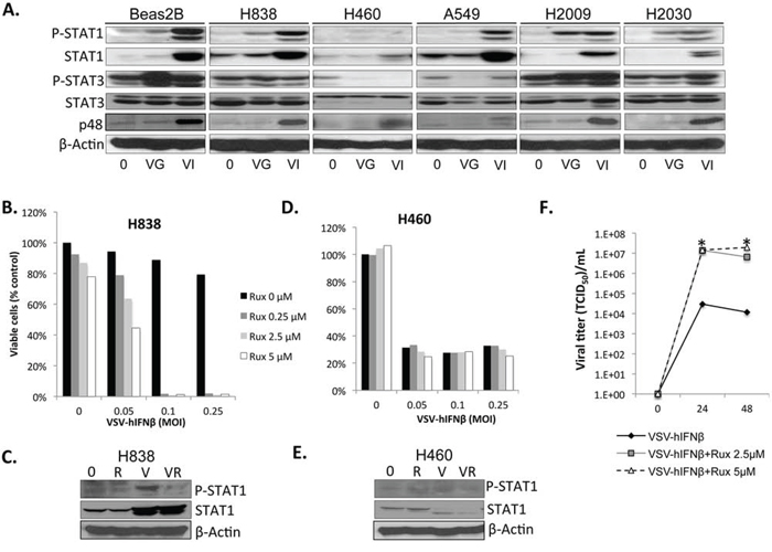 Figure 2: NSCLC cells are defective in IFN response to viral infection. NSCLC cells were infected with VSV-GFP and VSV-hIFNβ, and cell lysates were prepared after 24 hours of infection at an MOI of 0.1. A. Signaling proteins in the IFN response were assayed by immunoblot. β-actin was used as a loading control. 0, untreated; VG, VSV-GFP; VI, VSV-hIFNβ. B–E. H838 cells and H460 cells grown in 96-well plates were treated with VSV-hIFNβ alone at indicated MOI or in combination with ruxolitinib at indicated doses. Viable cells were assayed 72 hours after treatment (B and D). Western blots for p-STAT1 were done in H838 cells and H460 cells (C and E) to demonstrate inhibition of p-STAT1 in H838 cells after ruxolitinib treatment. 0 = untreated, R = ruxolitinib 250 nM V = VSV-hIFNβ MOI 0.1, VR = combination VSV-hIFNβ and ruxolitinib. F. Supernatants from cells treated in parallel to B) were collected and assayed for viral titer at 24 and 48 hours post-infection. Data are expressed as TCID50/mL. * denotes p < 0.01 compared to VSV-hIFNβ alone.