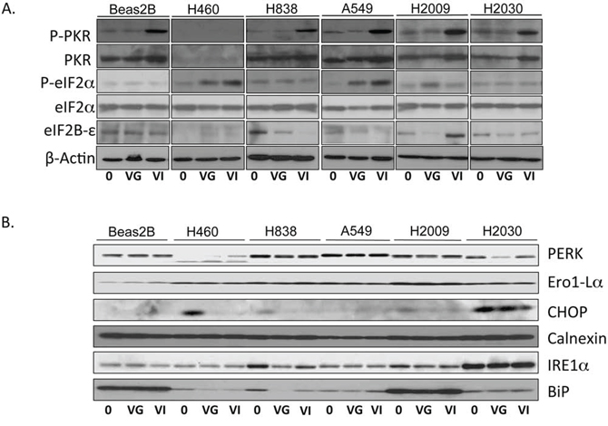 Figure 3: Western blot of PKR/eIF2α and ER stress pathway. NSCLC cells were infected with VSV-GFP and VSV-hIFNβ at an MOI of 0.1. Lysates were prepared 24 hours following infection and assayed by immunoblot. A. Immunoblot of PKR and eIF2 pathway. B. Immunoblot of ER stress proteins. 0, untreated; VG, VSV-GFP; VI, VSV-hIFNβ. β-Actin was used as a loading control. The β-Actin in A) was from the same lysates as the immunoblots in B).