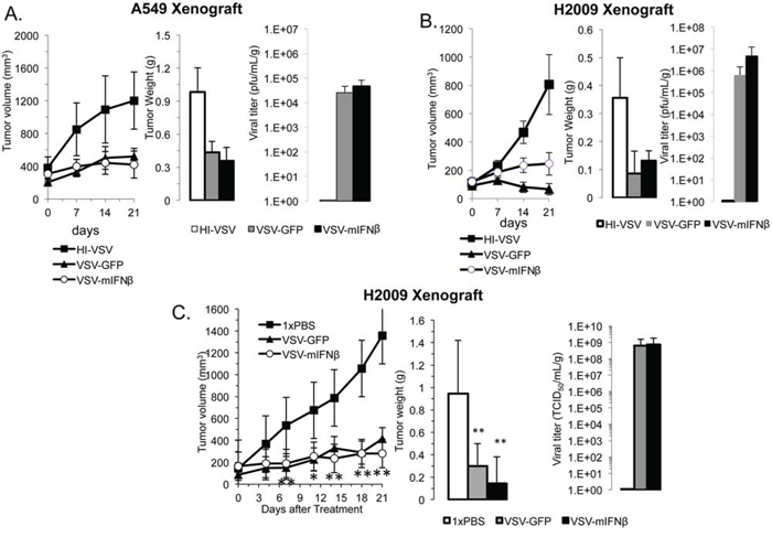 Figure 4: VSV has antitumor efficacy in human xenografts. Nude mice bearing A549 A. and H2009 B. xenografts were treated with 6.6 × 108 TCID50 heat-inactivated VSV (HI-VSV), VSV-GFP, or VSV-mIFNβ by intratumoral injection on days 0, 7, and 14. One week after the last injection (day 21), mice were sacrificed and tumors resected (n = 5 per group). Tumor volumes were measured with calipers in two dimensions (A and B, left). Tumors were weighed after sacrifice (A and B, middle). Viral titer was determined from resected tumors on day 21 (A and B, right). C. H2009 xenografts were treated with 1× PBS, 5 × 108 TCID50 VSV-GFP or VSV-mIFNβ given on days 0, 2, and 4 followed by observation until day 21. Tumor volume was measured by calipers twice weekly (left). All mice were sacrificed on day 21, and resected tumors were weighed (middle) and assayed for viral titer on day 21 (right). Error bars indicate standard error of the mean (SEM), * indicates p-value < 0.05, ** indicates p-value < 0.001.