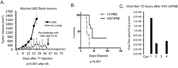 Figure 5: VSV-mIFNβ treatment of LM2 in immune competent A/J mice. A. Mice (n = 10) were treated with intratumoral injections of 1× PBS or VSV-mIFNβ at a dose of 1.5 × 1010 TCID50 every other day for 3 doses. Estimate of tumor volume based on 2-dimensional measurements are shown. At day 45, 3 mice had no visible tumors and were re-challenged with 1 × 106 LM2 cells injected in the flank. After 30 days, no tumors grew in these mice. B. Kaplan-Meier curve of survival of mice as defined as the date mice were sacrificed either because there tumors were larger than 1.5 cm3 or they had ulcerated tumor requiring sacrifice in accordance with ethical standards. Data were analyzed with log rank test and curves were significantly different (p < 0.001). C. A separate group of 5 mice were similarly treated with 1.5 × 1010 TCID50 VSV-mIFNβ and were sacrificed 72 hours later. Viral titers from resected tumors were determined using plaque assay. Four mice were treated with VSV-mIFNβ and one mouse was given PBS (Con). Error bars indicate standard deviation.