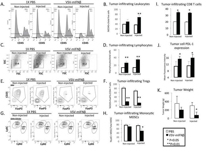 Figure 6: Flow cytometric analysis of tumor infiltrating leukocytes in injected and contralateral non-injected tumors after treatment with VSV-mIFNβ or 1× PBS. A. Representative histograms of CD45+ leukocytes. B. Pooled data from n = 5 mice of total tumor infiltrating leukocytes. C. Representative scatter plot of lymphocyte population from VSV-mIFNβ-treated and control mice. FSC = Forward Scatter, SSC = Side scatter D. Pooled data from n = 5 mice of the total tumor infiltrating lymphocyte population. E. Representative Tumor infiltrating CD4+CD25+FoxP3+ Treg cells. F. Pooled data from n = 5 mice of the percentage of tumor infiltrating Treg cells. G. Representative histograms of tumor infiltrating monocytic MDSC (CD11b+Ly6ChiLy6G-) and polymorphonuclear MDSC (CD11b+Ly6CintLy6G+) cells. H. Pooled data of percentage of tumor infiltrating monocytic MDSC. I. Pooled data of percentage of tumor infiltrating CD8+ T cells. J. Pooled data of PDL-1 expression in CD45-tumor cells. Data are expressed as the Mean fluorescence intensity (PDL-1 expression/Isotype IgG). For each of the bar graphs, error bars indicate standard deviation. * denotes p < 0.05, ** denotes p < 0.001 comparing VSV-mIFNβ treated mice to PBS-treated mice. K. Tumor weights at the time of sacrifice 10 days after 1st VSV-mIFNβ injection. Error bars indicate standard deviation.