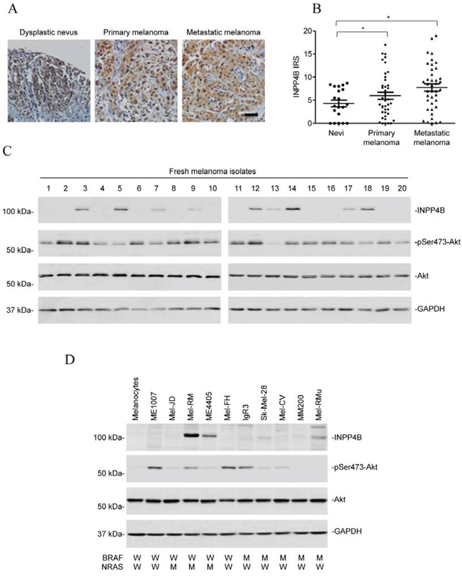 Figure 1: INPP4B is commonly upregulated in melanomas. A. Representative microphotographs of IHC staining of INPP4B in melanocytic tumour tissue arrays. Scale bar, 100 μm. B. Comparison of INPP4B expression among nevi (n = 20), primary melanomas (n = 40), and metastatic melanomas (n = 40) determined by IHC staining. Data shown are mean immunoreactive score (IRS) ± SEM. *P < 0.05, Kruskal-Wallis test. C. Whole cell lysates from a panel of fresh metastatic melanoma isolates were subjected to Western blot analysis of INPP4B, phosphorylated Akt (pSer473-Akt), Akt and GAPDH (as a loading control). The data shown are representative of three individual experiments. D. Whole cell lysates from pooled melanocytes of three different lines (HEMa-LP, HEMn-MP and HEMn-DP) and melanoma cell lines were subjected to Western blot analysis of INPP4B, phosphorylated Akt (pSer473-Akt), Akt and GAPDH (as a loading control). The data shown are representative of three individual experiments.