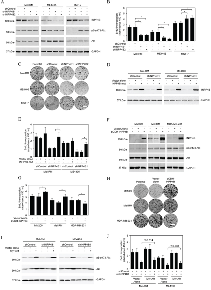 Figure 2: INPP4B promotes proliferation of melanoma cells independently of Akt. A. Whole cell lysates from Mel-RM and ME4405 melanoma cells and MCF-7 breast cancer cells stably transduced with the control shRNA (shControl) or two INPP4B shRNAs (shINPP4B1 and shINPP4B2) were subjected to Western blot analysis of INPP4B, phosphorylated Akt (pSer473-Akt), Akt and GAPDH (as a loading control). The data shown are representative of three individual experiments. B. Mel-RM, ME4405 and MCF-7 cells were stably transduced with the control shRNA (shControl) or two INPP4B shRNAs (shINPP4B1 and shINPP4B2). Forty-eight hours later, cells were subjected to BrdU incorporation assays. The data shown are mean ± SEM of three individual experiments. *P < 0.05, Student's t-test. C. Mel-RM, ME4405 and MCF-7 cells stably transduced with the control shRNA (shControl) or two INPP4B shRNAs (shINPP4B1 and shINPP4B2) were subjected to clonogenic assays. The data shown are representative of three individual experiments. Scale bar, 1cm. D. Mel-RM and ME4405 cells stably transduced with shControl or shINPP4B1 were transduced with a shRNA-resistant mutant form of INPP4B (INPP4B-mut). Forty-eight hours later, whole-cell lysates were subjected to Western blot analysis. The data shown are representative of three individual experiments. E. Mel-RM and ME4405 cells stably transduced with shControl or shINPP4B1 were transduced with a shRNA-resistant mutant form of INPP4B (INPP4B-mut). Forty-eight hours later, cells were subjected to the BrdU incorporation assay. The data shown are mean ± SEM of three individual experiments. *P < 0.05, Student's t-test. F. Whole cell lysates from MM200 and Mel-RM melanoma cells and MDA-MB-231 breast cancer cells stably transduced with the vector alone or INPP4B cDNA cloned in the pCDH vector (pCDH-INPP4B) were subjected to Western blot analysis of INPP4B, phosphorylated Akt (pSer473-Akt), Akt and GAPDH (as a loading control). The data shown are representative of three individual Western blot analyses. G. MM200, Mel-RM and MDA-MB-231 cells stably transduced with the vector alone or INPP4B cDNA cloned in the pCDH vector (pCDH-INPP4B) were subjected to BrdU incorporation assays. The data shown are mean ± SEM of three individual experiments. *P < 0.05, Student's t-test. H. MM200, Mel-RM and MDA-MB-231 cells stably transduced with the vector alone or INPP4B cDNA cloned in the pCDH vector (pCDH-INPP4B) were subjected clonogenic assays. The data shown are representative of three individual experiments. Scale bar, 1cm. I. Mel-RM and ME4405 cells stably transduced with shControl or shINPP4B1 were transduced with the vector alone or myr-Akt cDNA. Forty-eight hours later, whole cell lysates were subjected to Western blot analysis of phosphorylated Akt (pSer473-Akt), Akt and GAPDH (as a loading control). The data shown are representative of three individual Western blot analyses. J. Mel-RM and ME4405 cells stably transduced with shControl or shINPP4B1 were transduced with the vector alone or myr-Akt cDNA. Forty-eight hours later, cells were subjected to BrdU incorporation assays. The data are mean ± SEM of three individual experiments.