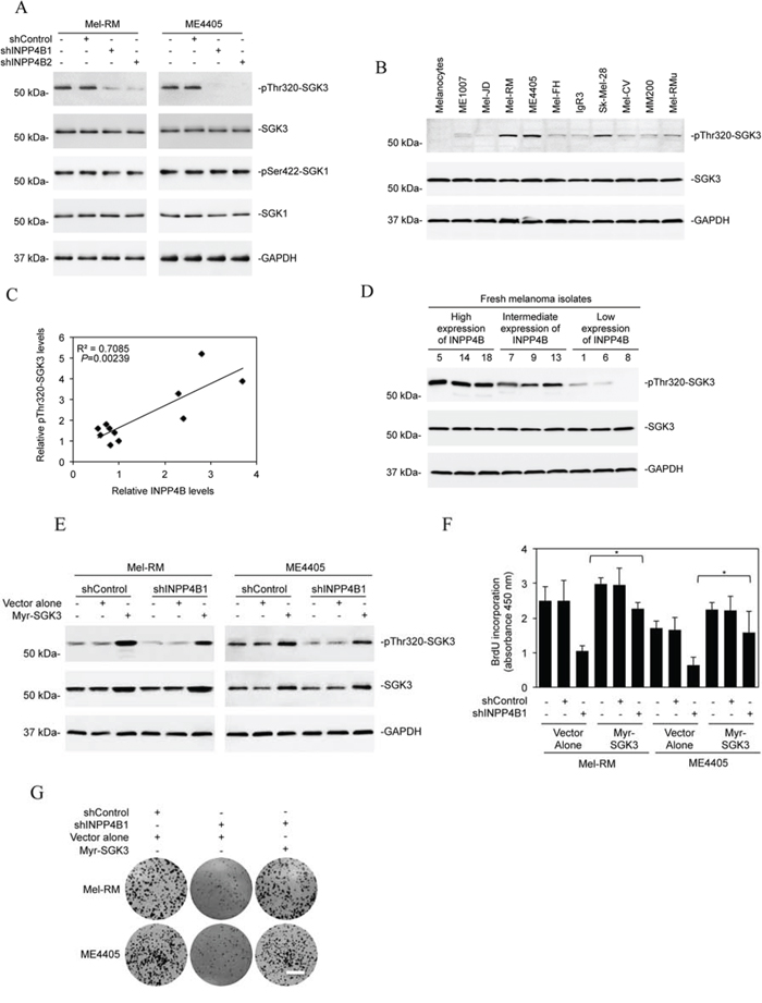 Figure 3: SGK3 is involved in INPP4B-mediated melanoma cell proliferation. A. Whole cell lysates from Mel-RM and ME4405 cells stably transduced with the control shRNA (shControl) or INPP4B shRNA1 (shINPP4B1) were subjected to Western blot analysis of phosphorylated SGK3 (pThr320-SGK3), SGK3, phosphorylated SGK1 (pSer422-SGK1), SGK1, and GAPDH (as a loading control). The data shown are representative of three Western blot analyses. B. Whole cell lysates from the panel of melanoma cells lines and pooled melanocytes of three different lines (HEMa-LP, HEMn-MP and HEMn-DP) as shown in Figure 1D were subjected to Western blot analysis of phosphorylated SGK3 (pThr320-SGK3), SGK3 and GAPDH (as a loading control). The data shown are representative of three individual experiments. C. Regression analysis of the relationship between the levels of INPP4B expression as shown in Figure 1D and SGK3 activation as shown in Figure 3B. D. Whole-cell lysates from fresh melanoma isolates with relatively low, intermediate, and high levels of INPP4B were subjected to Western blot analysis of phosphorylated SGK3 (pThr320-SGK3), SGK3 and GAPDH (as a loading control). The data shown are representative of three individual Western blot analyses. E. Mel-RM and ME4405 cells stably transduced with the control shRNA (shControl) or INPP4B shRNA1 (shINPP4B1) were transduced with the vector alone or myr-SGK3 cDNA. Whole cell lysates were subjected to Western blot analysis of phosphorylated SGK3 (pThr320-SGK3), SGK3 and GAPDH (as a loading control). The data shown are representative of three individual Western blot analyses. F. Mel-RM and ME4405 cells stably transduced with the control shRNA (shControl) or INPP4B shRNA1 (shINPP4B1) were transduced with the vector alone or myr-SGK3 cDNA. Cells were subjected to BrdU incorporation assays. The data are mean ± SEM of three individual experiments. *P < 0.05, Student's t-test. G. Mel-RM and ME4405 cells stably transduced with the control shRNA (shControl) or INPP4B shRNA1 (shINPP4B1) were transduced with the vector alone or myr-SGK3 cDNA. Cells were subjected to clonogenic assays. The data shown are representative of three individual clonogenic assays. Scale bar, 1cm.