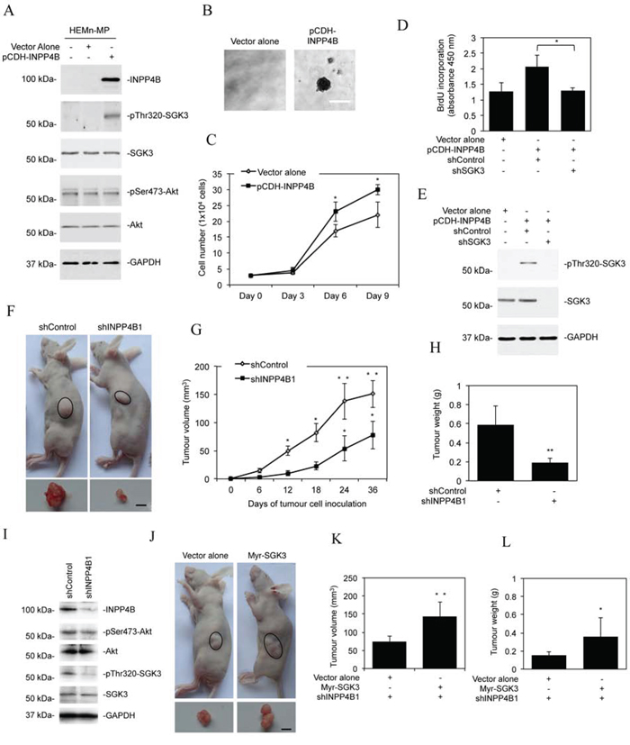 Figure 4: INPP4B promotes melanoma growth. A. Whole cell lysates from HEMn-MP melanocytes stably transduced with the vector alone or INPP4B cDNA cloned in the pCDH vector (pCDH-INPP4B) were subjected to Western blot analysis of INPP4B, phosphorylated SGK3 (pThr320-SGK3), SGK3, phosphorylated Akt (pSer473-Akt), Akt and GAPDH (as a loading control). The data shown are representative of three individual Western blot analyses. B. Representative microphotographs of anchorage-independent growth of HEMn-MP melanocytes transduced with INPP4B cDNA cloned in the pCDH vector (pCDH-INPP4B). The data shown are representative of three individual clonogenic assays. Scale bar, 0.5 mm. C. Comparison of numbers of HEMn-MP melanocytes on day 3, 6, and 9 after being transduced with the vector alone or pCDH-INPP4B. The data shown are mean ± SEM of three individual experiments. *P < 0.05, Student's t-test. D. HEMn-MP melanocytes transduced with the vector alone or pCDH-INPP4B were transduced with the control shRNA (shControl) or SGK3 shRNA (shSGK3). Forty-eight hours later, cells were subjected to BrdU incorporation assays. The data shown are mean ± SEM of three individual experiments. *P < 0.05, Student's t-test. E. HEMn-MP melanocytes transduced with the or pCDH-INPP4B were transduced with the control shRNA (shControl) or SGK3 shRNA (shSGK3). Forty-eight hours later, whole-cell lysates were subjected to Western blot analysis of phosphorylated SGK3 (pThr320-SGK3), SGK3 and GAPDH (as a loading control). The data shown are representative of three individual experiments. F. Representative photographs showing that xenografts of Mel-RM cells transduced with the INPP4B shRNA1 (shINPP4B1) are smaller than those with the control shRNA (shControl) (n = 8). Scale bar, 5 mm. G. Comparison of growth curves of xenografts of Mel-RM cells transduced with the INPP4B shRNA1 (shINPP4B1) and those with the control shRNA (shControl). The data shown are mean ± SEM, n = 8. **P < 0.01, *P < 0.05 Student's t-test. H. Comparison of weight of harvested xenografts of Mel-RM cells transduced with the INPP4B shRNA1 (shINPP4B1) and those with the control shRNA (shControl). The data shown are mean ± SEM, n = 8. **P < 0.01, Student's t-test. I. Whole cell lysates of crude tumour tissues from representative harvested xenografts of Mel-RM cells transduced with the INPP4B shRNA1 (shINPP4B1) and those with the control shRNA (shControl) were subjected to Western blot analysis of INPP4B, phosphorylated Akt (pSer473-Akt), Akt, phosphorylated SGK3 (pThr320-SGK3), SGK3 and GAPDH (as a loading control). The data shown are representative of three individual Western blot analyses. J. Representative photographs showing that xenografts of Mel-RM cells transduced with the INPP4B shRNA1 (shINPP4B1) co-introduced with the cDNA encoding myr-SGK3 are larger than those co-introduced with the vector alone. (n = 8). Scale bar, 5 mm. K. Comparison of growth curves of xenografts of Mel-RM cells transduced with the INPP4B shRNA1 (shINPP4B1) co-introduced with the cDNA encoding myr-SGK3 and those co-introduced with the vector alone. The data shown are mean ± SEM, n = 8. **P < 0.01, Student's t-test. L. Comparison of weight of harvested xenografts of Mel-RM cells transduced with the INPP4B shRNA1 (shINPP4B1) co-introduced with cDNA encoding myr-SGK3 and those co-introduced with the vector alone. The data shown are mean ± SEM, n = 8. *P < 0.05, Student's t-test.