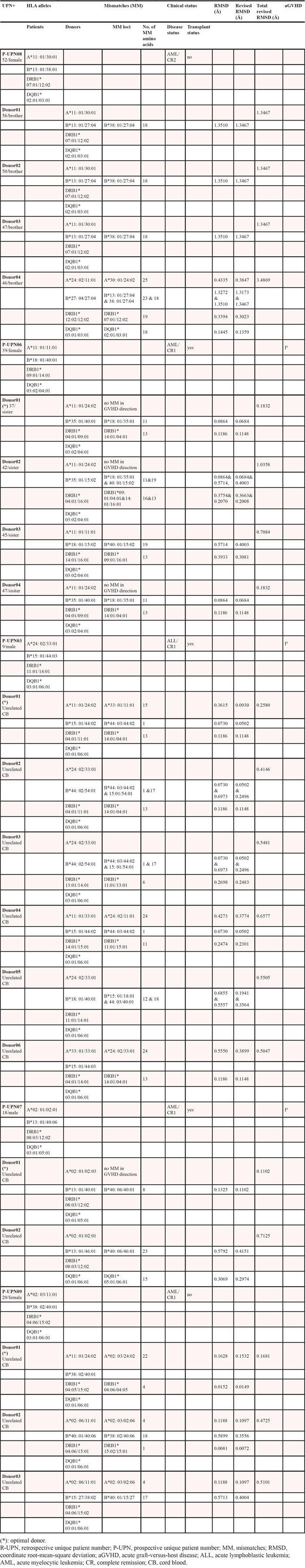 All of 20 recipients who entered this study underwent either related allo-HSCT or unrelated CB transplantation. As shown in Table 3, there was a strong correlation between single or total revised RMSD and the occurrence of severe aGVHD. The 6 recipient-donor pairs with 1 allele mismatching at either HLA-A or -B locus had a lower single revised RMSD (less than 0.50Å before allo-HSCT) and only I − II0 aGVHD occurred in these recipients after transplantation. All of recipient-donor pairs who developed severe aGVHD had a higher single or total revised RMSD (>0.50Å) before allo-HSCT, but not relevant to individual HLA-allele, allele group, loci, especially fixed combinations of different allele/loci. In addition, 2 recipient-donor pairs, P-UNP-01 and P-UNP-3, with an HLA-haploidentical mismatching had the highest total revised RMSD (1.4094Å and 1.2944Å) before allo-HSCT, and developed severe IV0 aGVHD after transplantation (Tables 2 and 3).