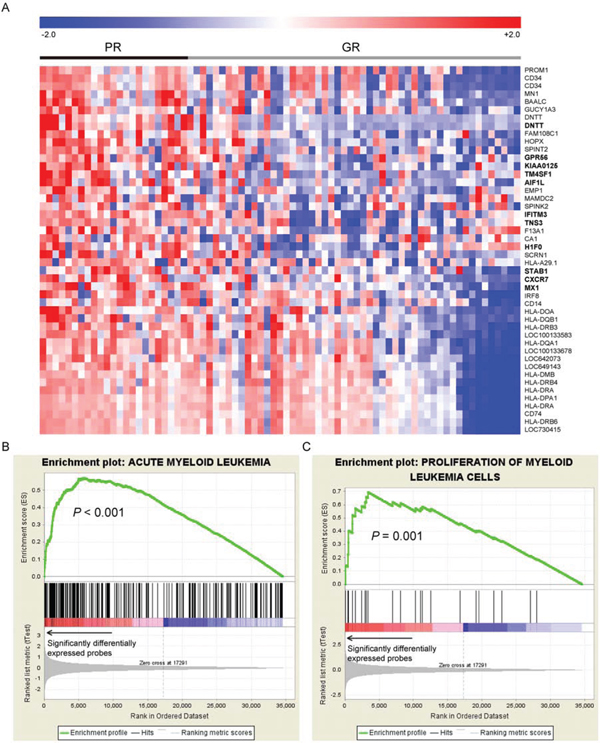 Figure 1: A. The heatmap of the 46 differential expressed probes between the 19 patients with poor response (PR group) to the first induction chemotherapy and the 56 achieving continuous complete remission (GR group). The 11 genes which were significantly associated with OS were highlighted in bold text. GSEA enrichment plots on genes associated with functions of B. acute myeloid leukemia and C. proliferation of myeloid cells are shown. The GSEA plots were used to confirm and visualize the significant terms reported by IPA. GSEA first ranked all genes probed on the microarray based on their significance in differential expression between PR and GR groups (denoted by an arrow in the figure). For a significant IPA term (component genes of which are denoted by black line segments), GSEA adopted a walking scoring method (green curve) to measure the degree to which the genes within an IPA term is overrepresented (i.e., enriched) to the left of all genes. Significance of the enrichment score was assessed by a permutation test. As a result, genes related to the two functions were significantly differentially expressed between the PR and GR groups, suggesting significant correlations between these two pathways and the treatment response.