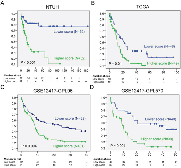 Figure 2: The Kaplan Meier curves for OS according to the scores. A. In NTUH discovery set, patients with higher scores have significant shorter OS than those with lower scores (median 17.0 months vs. not reached, P < 0.001); B–D. In the three validation cohorts, the higher scores are all associated with poorer OS (median 12.2 vs 21.3 months, log rank P = 0.01 in TCGA; median 8.4 vs 24.7 months, log rank P = 0.004 in GSE12417-GPL96; median 10.1 vs 42.6 months, log rank P = 0.001 in GSE12417-GPL570).