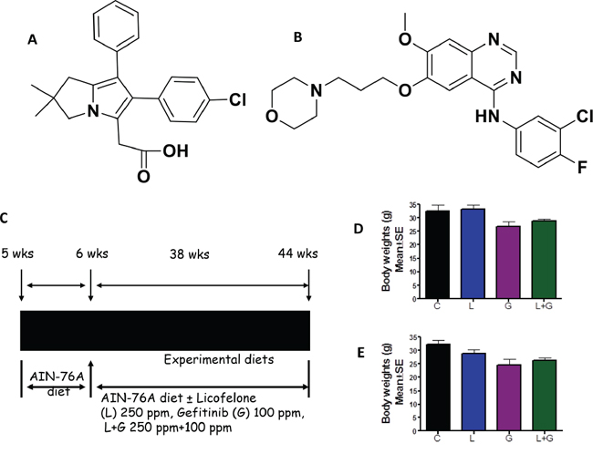 Figure 1: Experimental design for evaluation of licofelone and gefitinib efficacy in PC prevention in GEM. A–B. Structure of licofelone (A) and gefitinib (B) C. Experimental design for evaluation of licofelone, gefitinib, and a combination of licofelone (L) + gefitinib (G) efficacy in PC inhibition in male and female p48Cre/+-LSL-KrasG12D/+ GEM mice. At six weeks of age, groups of mice (24–34/group for activated p48Cre/+-LSL-KrasG12D/+ or 12/group for wild-type) were continuously fed AIN-76A diets containing 0, 250 ppm licofelone, or 100 ppm gefitinib, alone or in combination, for 38 weeks. Each pancreas was evaluated histopathologically for marker expression as described in the text. D-E. Effect of licofelone, gefitinib, or the combination on bodyweight (BW; means ± SE) at termination of the experiment in male D. and female E. mice. No statistically significant differences were observed between control and drug-treated p48Cre/+-LSL-KrasG12D/+ or wild-type mice.