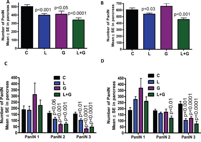 Figure 3: A–D. Effect of L, G, and L+G on PanIN multiplicity in male (A,C) and female (B,D) GEM mice (means ± SE).
