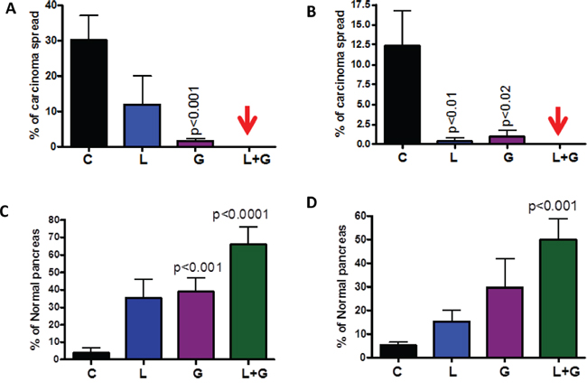 Figure 4: Effect of L, G and L+G on carcinoma percentage. A–B. Effect of L, G, and L+G on the percentage of pancreata with carcinoma (A-male, B-female). C–D. Effect of L, G, and L+G on the percentage of normal appearing pancreata (C-male, D-female). The data in the panels were analyzed by unpaired t-test with Welch's correction. Values are considered statistically significant at p < 0.05.