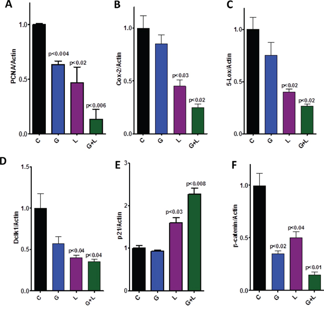 Figure 6: Effect of L, G, and L+G on protein expression of PCNA, COX-2, 5-LOX, DclK1, p21, and β-catenin, as determined by western immunoblotting. The combination of L+G significantly decreased PCNA, COX-2, 5-LOX, DclK1, and β-catenin expression, with an increase in p21 expression, compared with individual drug treatment.