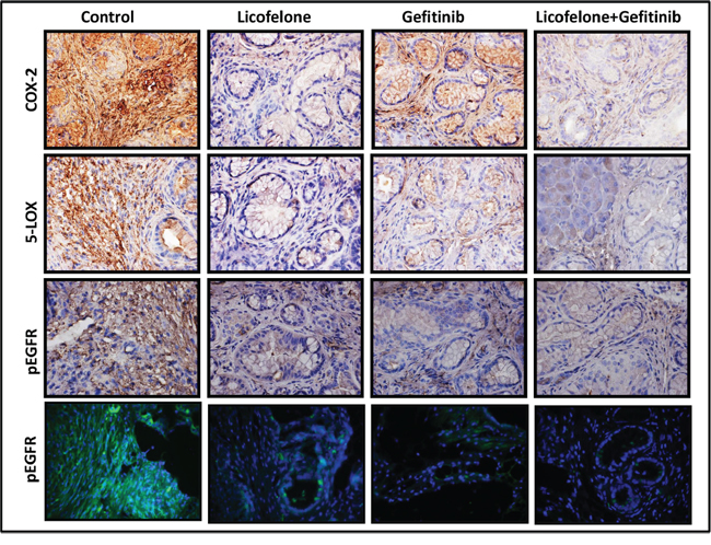 Figure 7: Effect of L, G, and L+G on COX-2, 5-LOX, and p-EGFR. Immunohistochemistry (COX-2, 5-LOX, p-EGFR) and immunofluorescence (bottom row) revealed reduced COX-2, 5-LOX, and p-EGFR expression with individual drug treatment and the combination.