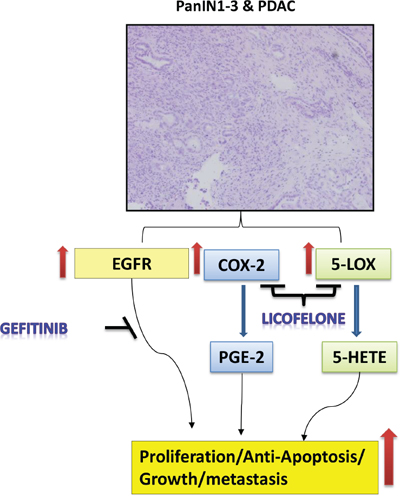 Figure 10: Schematic representation of effects of gefitinib and licofelone on PC progression. Hematoxylin and Eosin staining showing PanINs and PDAC. Pathways showing the effects of gefitinib and licofelone on inhibition of cell proliferation and tumor progression.