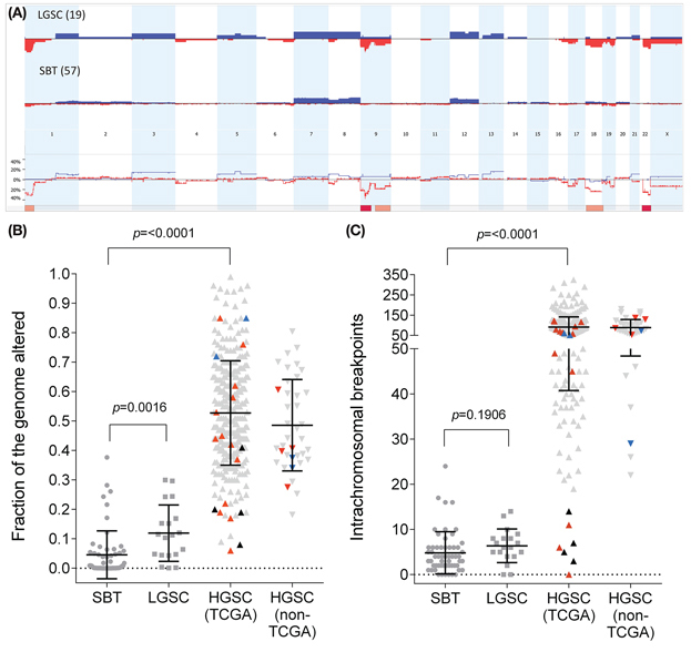 Figure 1: Genomic aberration levels in serous ovarian tumours. A. Cumulative copy number aberrations of LGSC cohort (n = 19, top panel) and SBT (n = 57, middle panel); and copy number difference plot (lower panel). Blue indicates copy number gains while red indicates copy number losses. The solid pink bars underneath indicate regions of genomic aberration that are enriched in LGSC compared to SBT (p < 0.01, FET), while solid red bars indicate highly significant enrichment (p < 0.001, FET). B. Fraction of the genome altered and C. Intrachromosomal breakpoint counts. Data points represent individual tumours, with mean and standard deviation of each cohort plotted. For the HGSC cohorts, light grey indicates typical TP53 mutant tumour, orange indicates TP53 wildtype tumour, blue indicates RAS/RAF mutations co-occuring with TP53 mutations, black indicates RAS/RAF mutant-TP53 wildtype tumour.