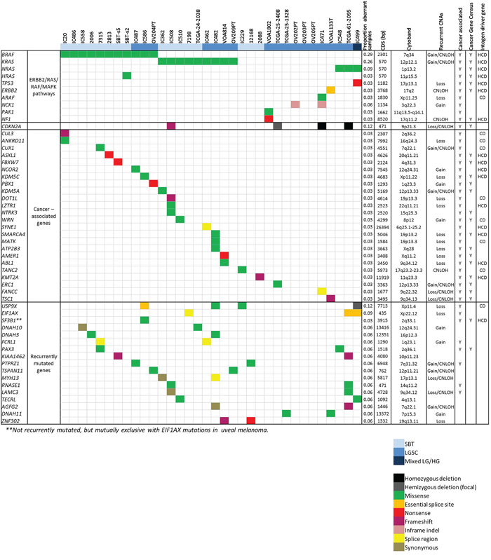 Figure 3: Mutation patterns in low grade serous ovarian tumours. Genes recurrently mutated and cancer genes mutated in low grade serous ovarian tumours. Cancer association is based on literature; COSMIC Cancer Gene Census (accessed January 2015); IntOGen driver genes are classified as HCD, high confidence drivers or CD, candidate drivers.