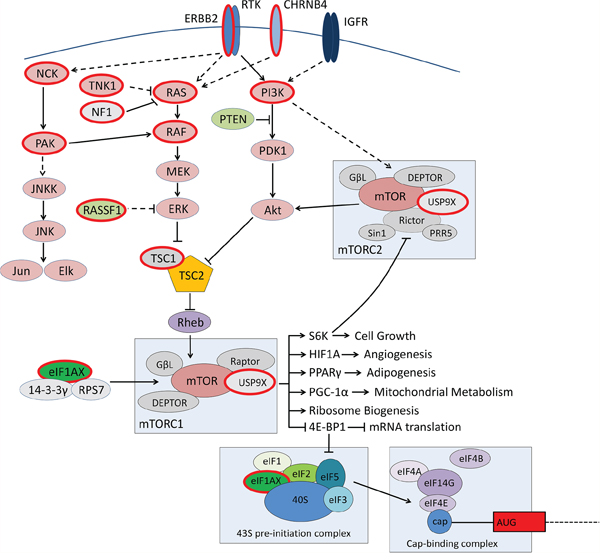 Figure 4: Molecular drivers of low grade serous ovarian tumours. Proteins circled in red indicate mutated genes identified in this study. Along with the central components of the ERBB2/RAS/RAF/MAPK pathway, a number of tumours also carried concurrent mutations in regulators of the pathway.