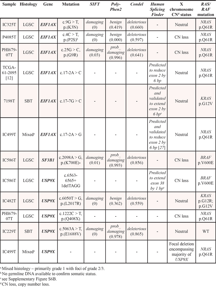 Exome sequencing identified two novel candidate genes, EIF1AX and USP9X, which are enriched in LGSC compared to SBT, suggesting they may be key contributors to carcinogenesis, although the biological impacts of mutant EIF1AX and USP9X in ovarian tumours remains to be determined. Mutations in these genes were almost exclusively identified in BRAF/KRAS/NRAS mutant tumours, suggestive of cooperative biological effects.