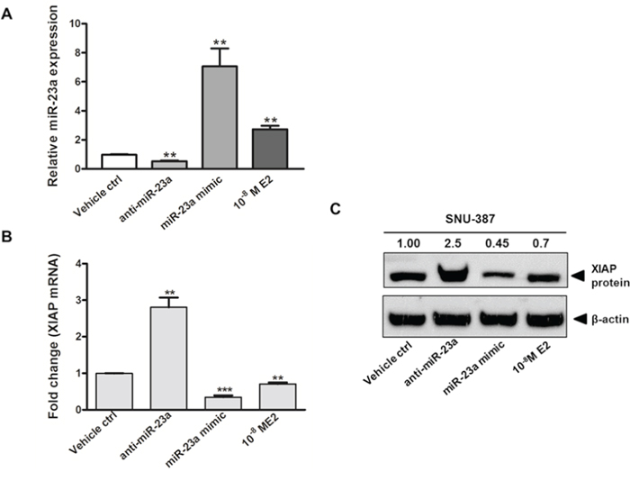 Figure 4: Gain of function and loss of function analysis on the expression of miR-23a and its effect on X-linked inhibitor of apoptosis protein (XIAP) expression in SNU-387 cells. Quantitative analysis on A. miR-23a expression; B. XIAP mRNA expression; and C. XIAP protein expression in SNU-387 cells transfected with miR-23a mimic (20 nM) or anti-miR-23a (20 nM), or with E2 (10−8M) treatment. Cells were collected for analysis at day 2 after treatment or transfection. Data represent means ± SEM from three independent experiments (***p < 0.0001, **p < 0.001 and *p < 0.01).