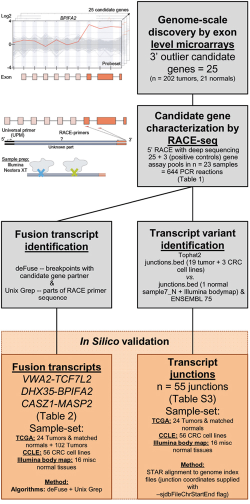 We have identified a set of novel transcript variants in CRC by a novel RACE-seq approach following an exon-level transcriptomics screen enabling simultaneous detection of variants from multiple genes and samples. Proof-of-concept was demonstrated by detection of known fusion transcripts involving TCF7L2, and alternative promoter usage in the VNN1 gene.