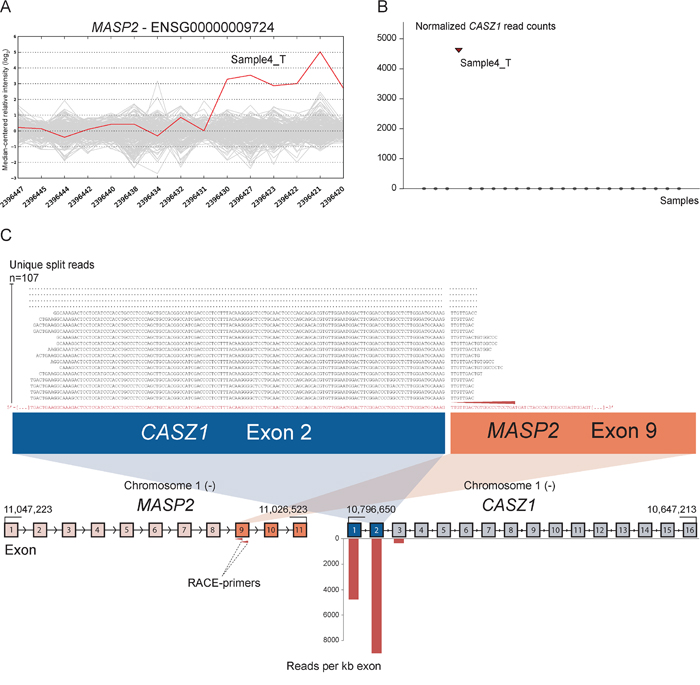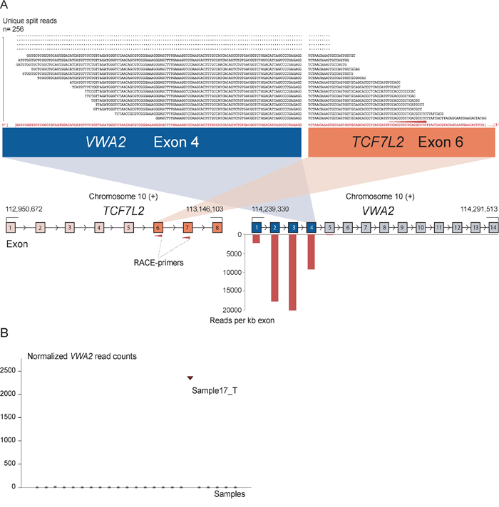 In terms of methodology, the idea of combining 5′ RACE with transcript variant characterization using paired-end sequencing shows potential for the identification of tissue- or disease-specific transcriptional structural changes. High-throughput sequencing characterization of RACE amplicons is highly time-efficient, more sensitive and technically feasible compared to traditional characterization of RACE fragments with cloning, plasmid isolation and Sanger sequencing. In our setup, we computationally nominated candidate genes with increased 3′ expression in CRC samples from exon microarray data to identify novel cancer-specific markers. However, the combination of 5′ RACE with paired-end sequencing also has other potential applications, such as testing for known fusion genes across tumor types or within different clinical cohorts. A future improvement would be to design RACE assays sufficiently downstream of suspected breakpoints to ensure sequencing reads on both ends, giving traditional fusion detection algorithms enough power to detect all fusions.