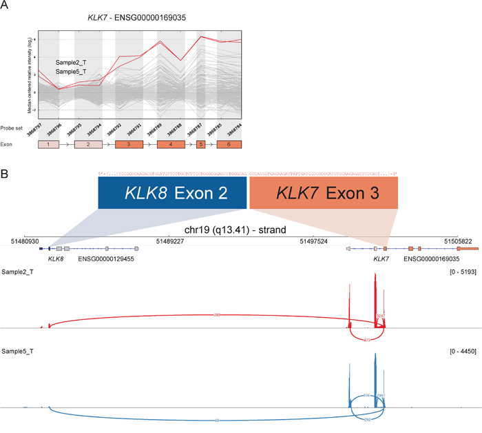 Figure 5: Read-through from upstream KLK8 to KLK7 in samples with deviating 3′ expression of KLK7. A. The exon expression profile of KLK7 shows that several samples have increased expression of probe sets targeting exon 3 to 6. The top two samples (2_T & 5_T) were selected for RACE-seq to identify underlying transcript structural changes. B. A sashimi plot from IGV shows the alignment of sequencing reads from the two nominated samples for KLK7. The height of the bars represents the number of aligned reads, while arcs represent junctions connected to exon 3 of KLK7 and the coverage of these junctions, as determined by Tophat2 alignment and the sashimi plot package, are shown as numbers on the arcs.