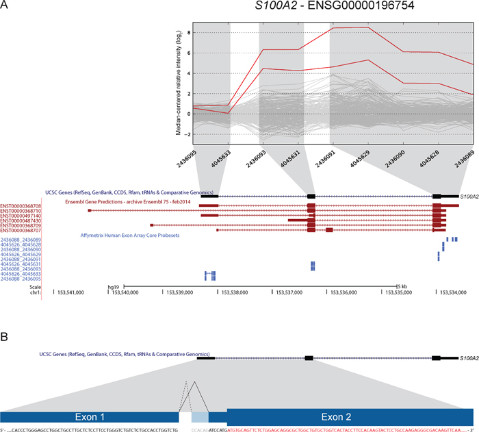 Figure 6: A novel 3′ splice-site in S100A2 is found to be overrepresented in CRC. A. Two samples had increased expression levels of probe sets targeting exons 2 and 3 of S100A2 (UCSC annotation). Ensembl release 75 has annotated additional transcript variants (in red; ENST00000368710, ENST00000368709) and upstream 5′ UTR exons that are not targeted by exon microarray probe sets. B. We identified the use of a novel 3′ splice-site when splicing exon 1 to exon 2. The splice-site is located 6 bp downstream of the canonical splice-site. Use of this alternative splice-site was found to be overrepresented in CRC samples (see Table 3). The splice-site occurs in the 5′ UTR (coding sequence in red), and according to our analysis does not alter the annotated ORF.