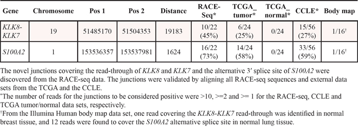 Table 3: Validation frequencies of KLK8-KLK7 and S100A2 junctions